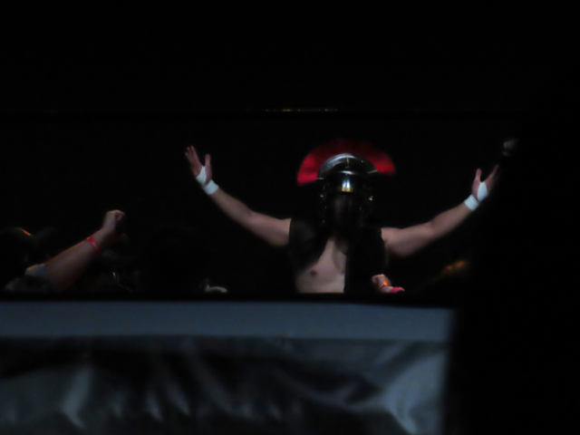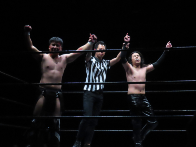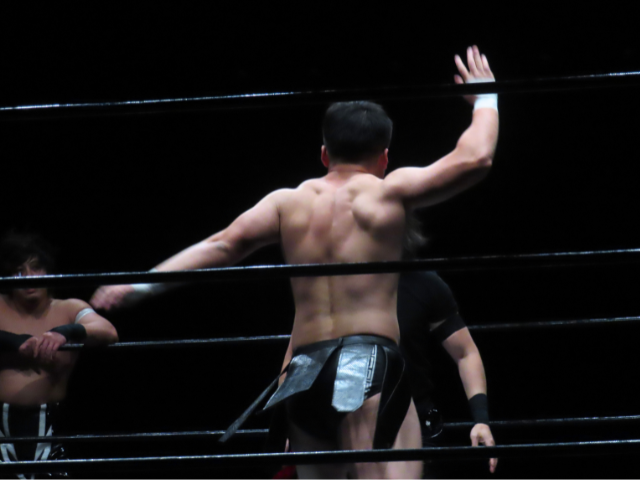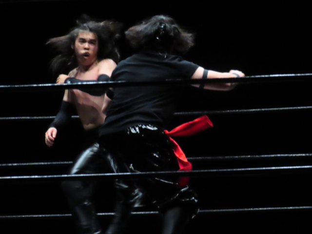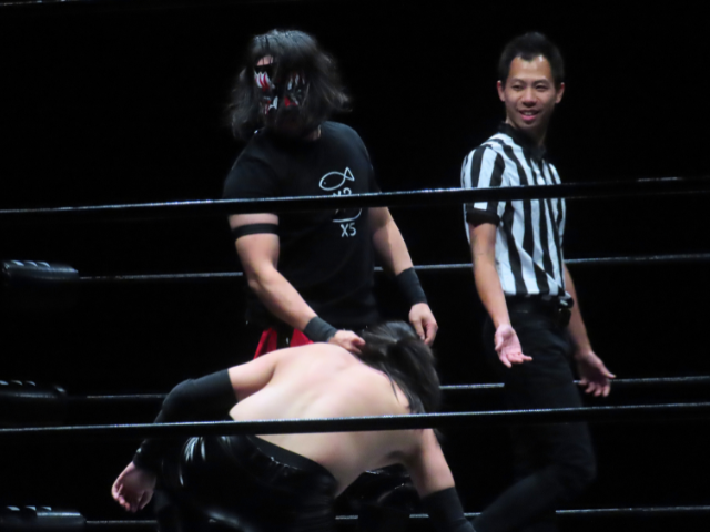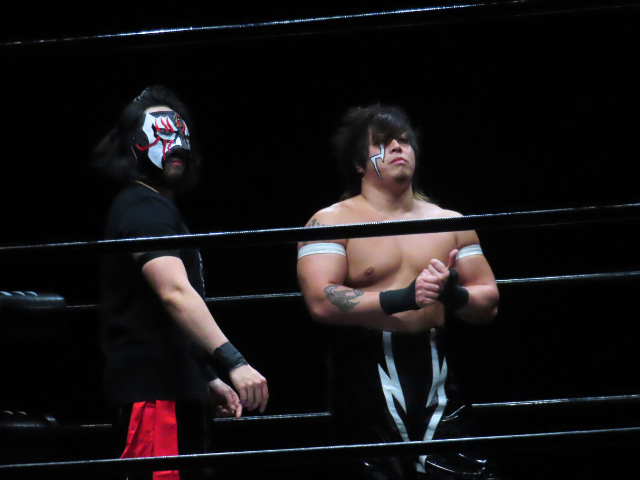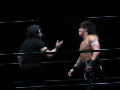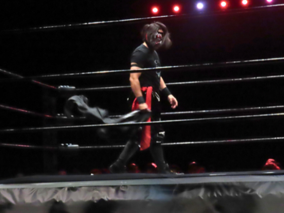 The Dragon Gate heel faction GAJYADOKURO member stepped onto the stage, and the crowd immediately erupted in cheers.